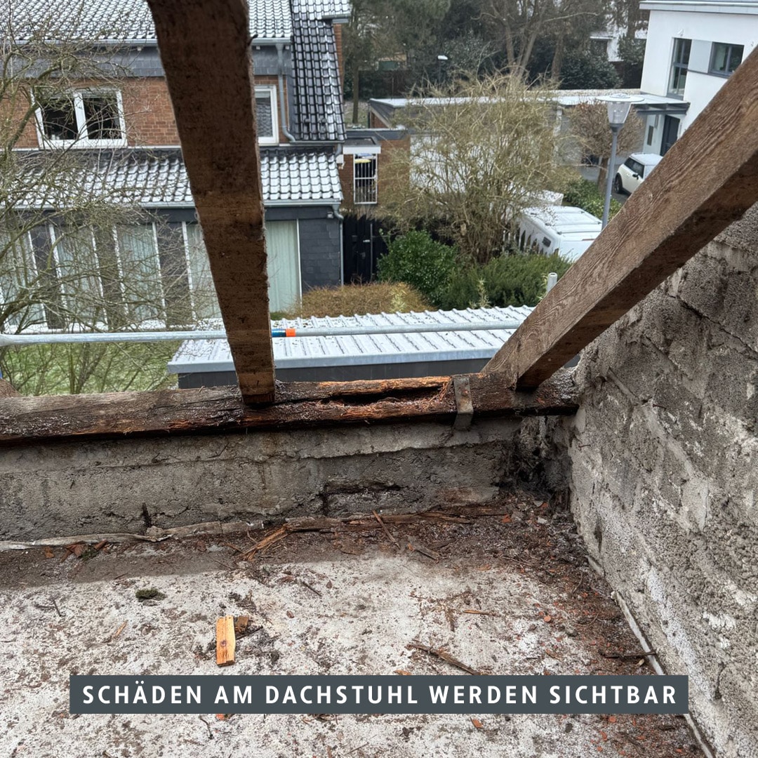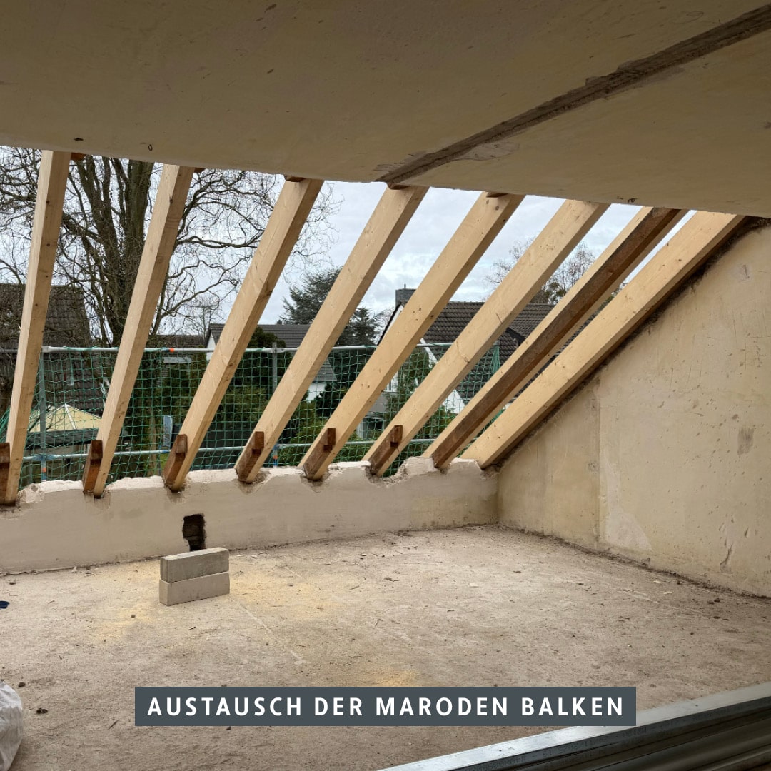 Im Dachbereich haben wir umfangreiche Sanierungsmaßnahmen umgesetzt: Schadhafte sowie statisch nicht mehr ausreichend tragfähige Holzbalken des Dachstuhls wurden fachgerecht ausgetauscht und teilweise durch konstruktive Verstärkungsmaßnahmen ertüchtigt. Dadurch konnten Tragfähigkeit, Standsicherheit und die dauerhafte Substanz des Gebäudes nachhaltig gesichert werden.